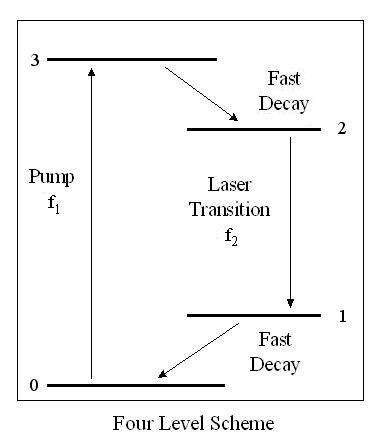 An atom is first excited by optical, electrical, or other means through the “pump transition” from a starting level “0” to a temporary level or group of levels “3”. The atom quickly relaxes to a metastable level “2”. Stimulated emission occurs from level “2” to level “1”. Level “1” quickly decays back to level “0”, so that absorption from level “1” to level ”2” is unlikely. At any given time more of the atoms are at level “2” than at level “1”, there is a “population inversion”. The rate of stimulated emission will exceed the absorption rate resulting in an optical amplifier.