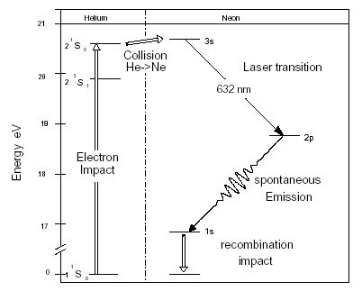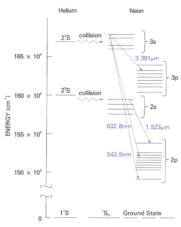 Two sets of excited states of neon (2s and 3s) occur at excitation energies similar to those of the 23S and 21S states of helium, which are favorably populated by the laser discharge. Within the plasma, atoms are rapidly colliding with other atoms, electrons, and with the walls of the tube. Collisions between excited state helium atoms and ground state neon atoms cause some of the neon atoms to be excited to the 2s and 3s states. (The labeling of these states is different from usual labeling of configurations and is explained here.) Collisional energy transfer is a resonant process in which the total energy is conserved. The small energy mismatch is compensated by changes in the kinetic energy of the atoms.
