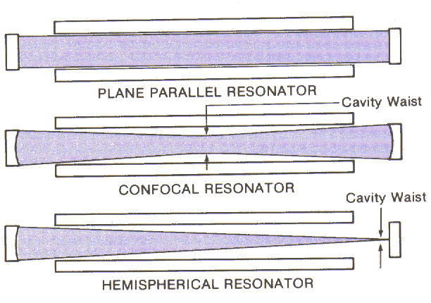 To sustain laser action it is usually necessary to place the lasing material between the two mirrors of an optical cavity. Some possible cavity designs are shown below.