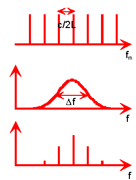 The resonant frequencies of a cavity of length L are fm = c/λ = mc/(2L). The separation between resonance frequencies is ∆f = c/2L. A typical visible wavelength laser resonator might have length L = 30 cm operating at wavelength λ = 600 nm so that m = 1 million. For an L = 30 cm resonator, the spacing between successive resonance frequencies is ∆f = c/2L = 500 MHz while the resonance frequencies are near fm = c/λ = 500 THz, one million times larger. Non-relativistic quantum mechanics predicts that atomic and molecular systems have stable excited states with discrete, well defined energy eigenvalues. But we observe that all excited state spontaneously decay. The uncertainty principle, ∆E∆t ~ ħ, then requires that the energies of the excited states, and therefore transition frequencies, cannot be known with arbitrary accuracy. We have ∆f∆t ~ 1/(2π). Several of the resonance frequencies fm may fall into that range ∆f. The spectrum emitted by a laser is a combination of the resonant frequencies fm that fall into that range ∆f. A representative laser output spectrum is shown below.