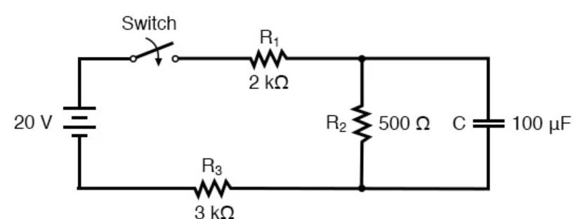 In the below circuit, the switch has been open for a long time before t = 0. The switch is then closed at t = 0. Find the voltage across the capacitor at t = 60 ms.